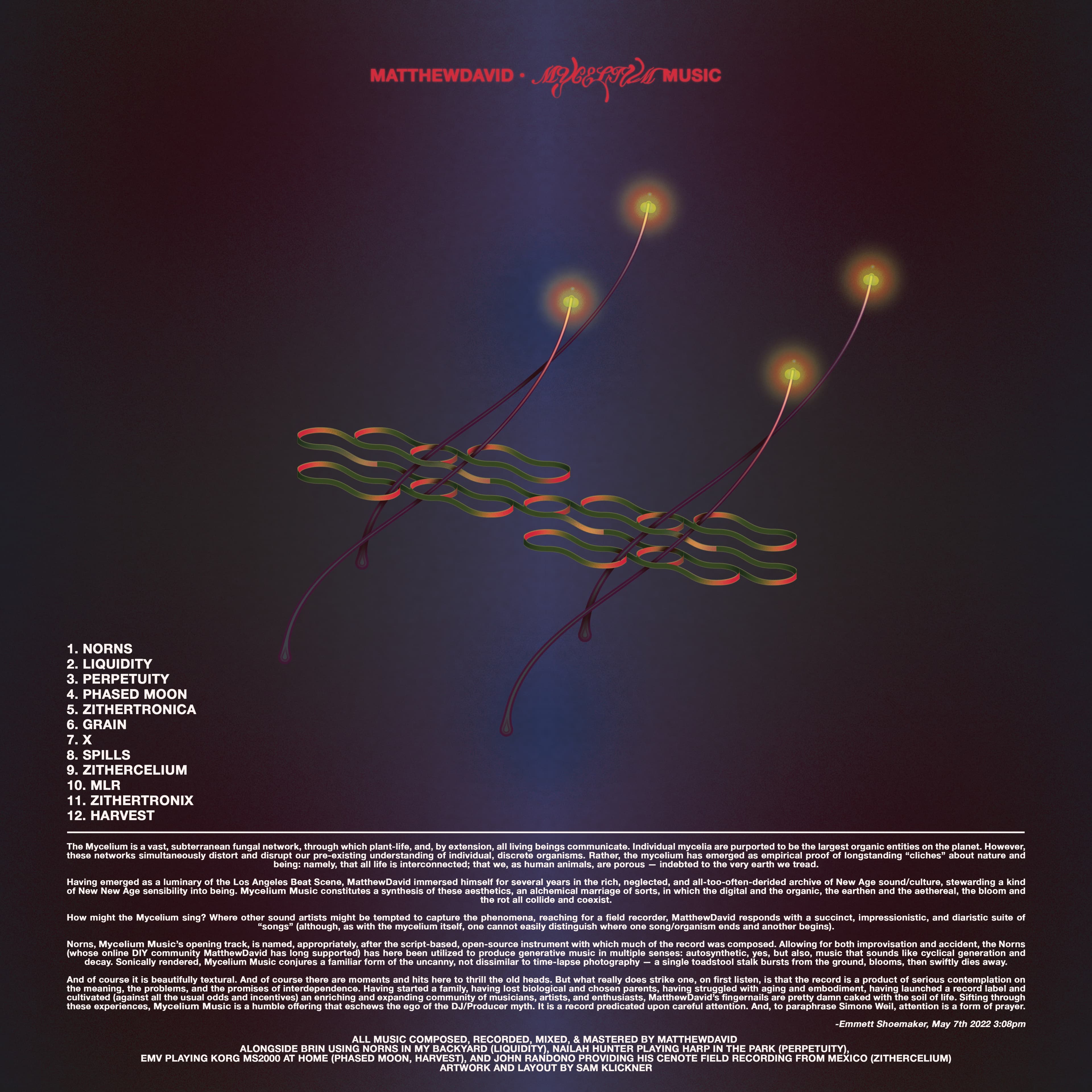Having emerged as a luminary of the Los Angeles Beat Scene, MatthewDavid immersed himself for several years in the rich, neglected, and all-too-often-derided archive of New Age sound/culture, stewarding a kind of New New Age sensibility into being. Mycelium Music constitutes a synthesis of these aesthetics, an alchemical marriage of sorts, in which the digital and the organic, the earthen and the aethereal, the bloom and the rot all collide and coexist.